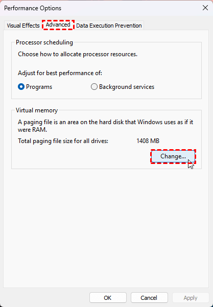 - Press Windows + R, type sysdm.cpl, and open Advanced > Performance > Settings > Advanced > Virtual memory.