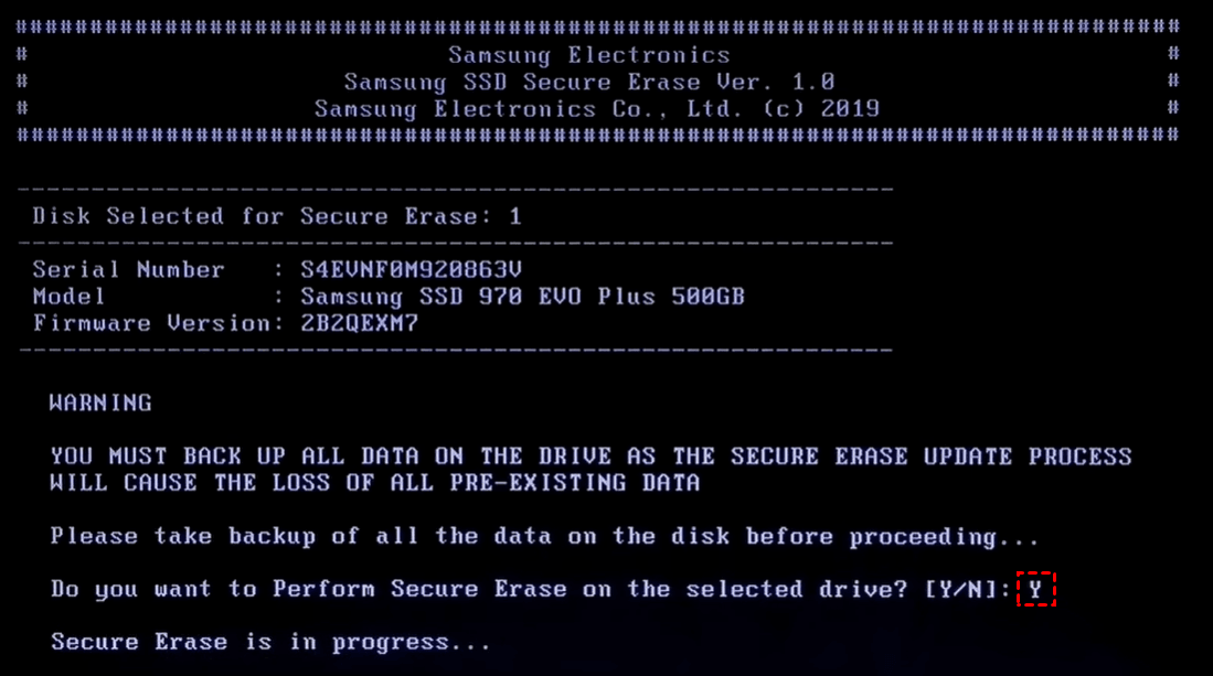 Step 8. On the WARNING page, type Y and hit Enter to begin wiping Samsung SSD.