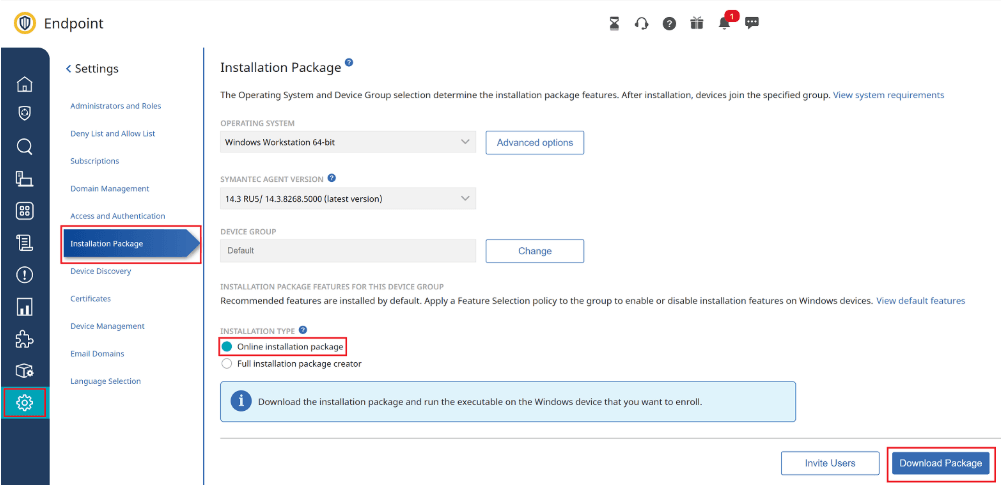 - Go to Settings > Installation Package, and then select Online installation package.