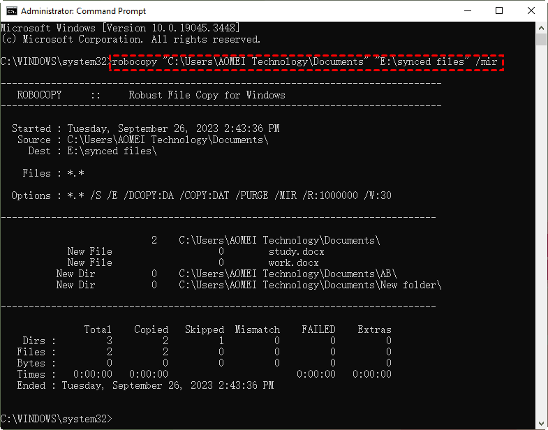 robocopy "C:\Users\AOMEI Technology\Documents" "E:\synced files" /mir