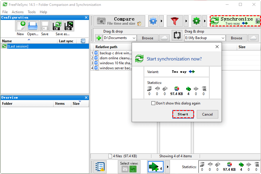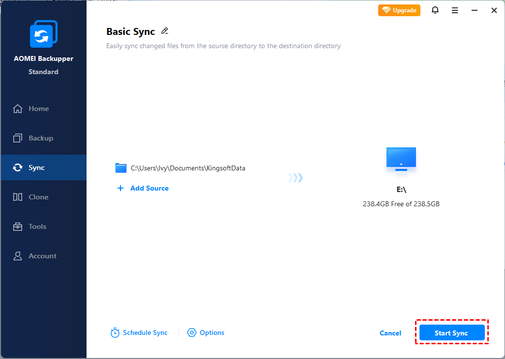 Step 4. Click Start Sync to begin. Once completed, your files will stay identical in both locations.