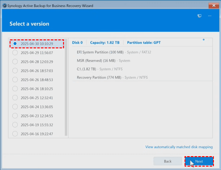 4. If you have multiple backup versions, click the drop-down menu to select a backup version to restore from. Then select Restore this system backup and click Next.