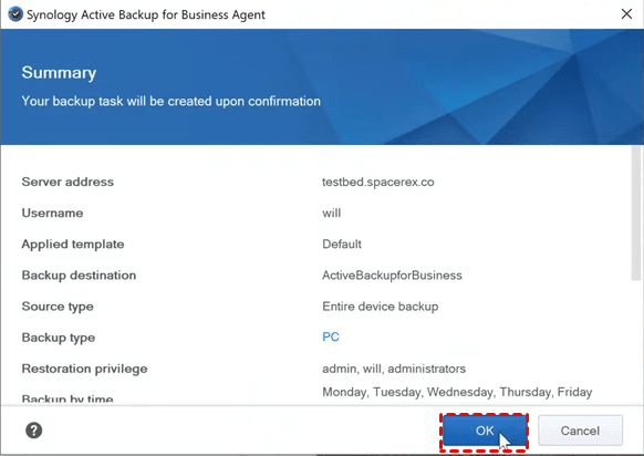 3. Once the target computer is connected to the Synology NAS, a backup task will be created based on the matching template. Review the backup settings and click OK.