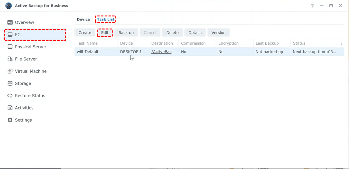 4.1. Open Active Backup for Business. Go to PC > Task List. Select the backup task just created and click Edit.