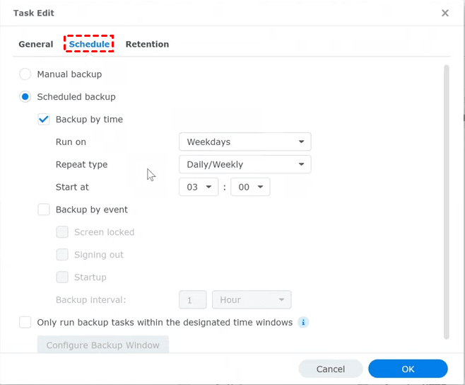 5. Click Schedule to enable automatic Windows backup (One Time, Daily, Weekly, Monthly, or Event triggers). Finally, click Start Backup to begin backing up Windows OS to your Synology NAS.