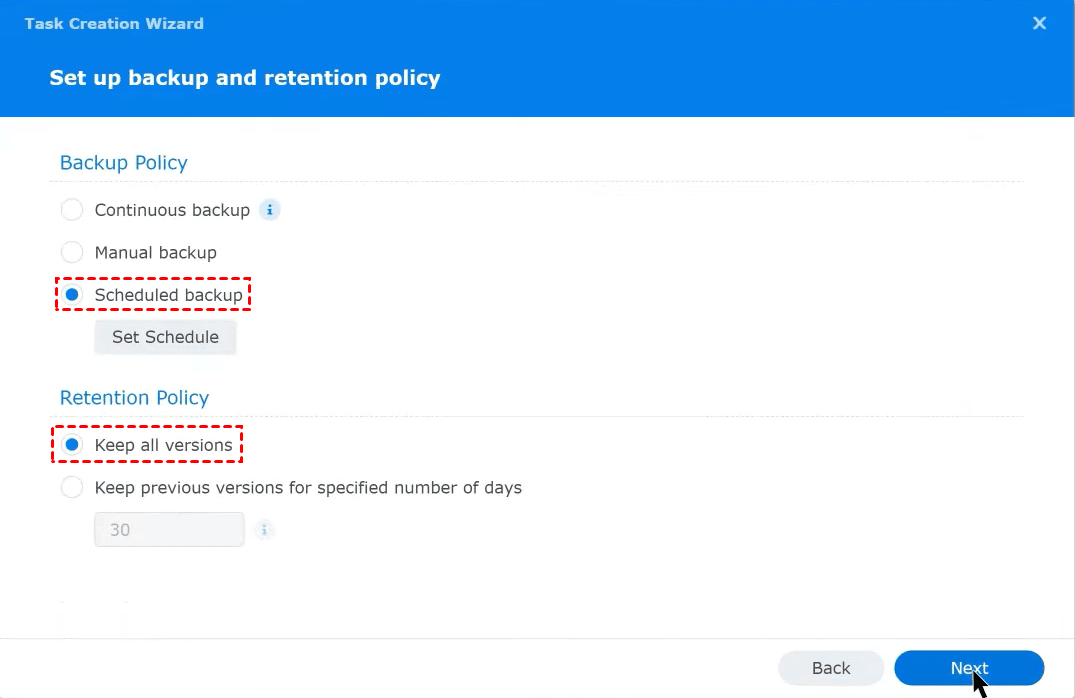 - Scheduled backup: Data are backed up based on the schedule you set.