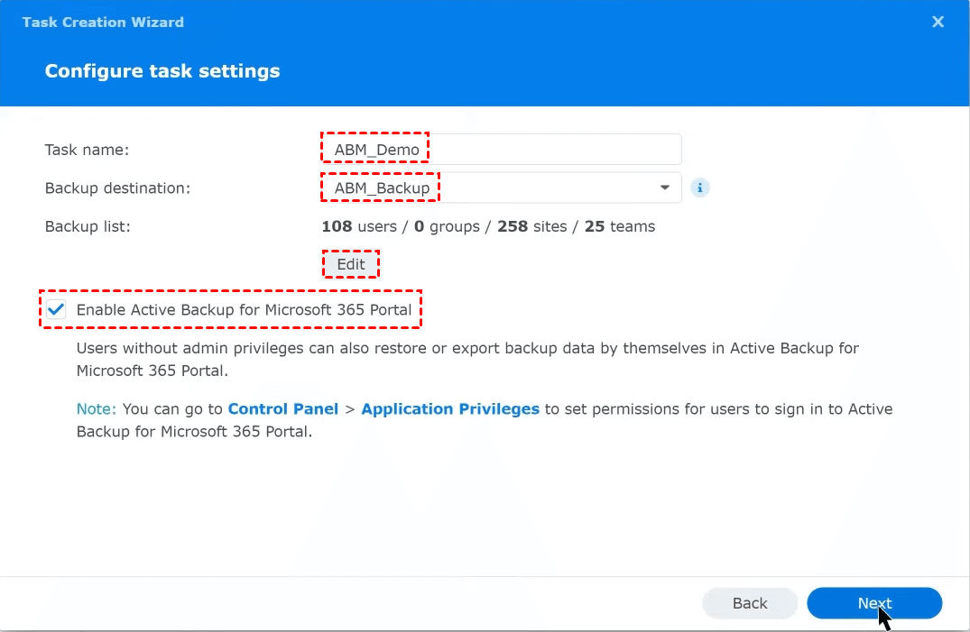 5. Configure the Task name, Backup destination, and Backup list. Enable the Active Backup for Microsoft 365 Portal if needed.