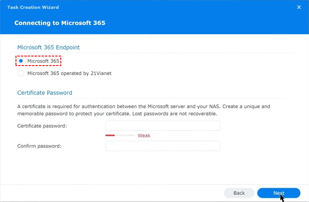 3. Select the Microsoft 365 endpoint type and then set a certificate password.