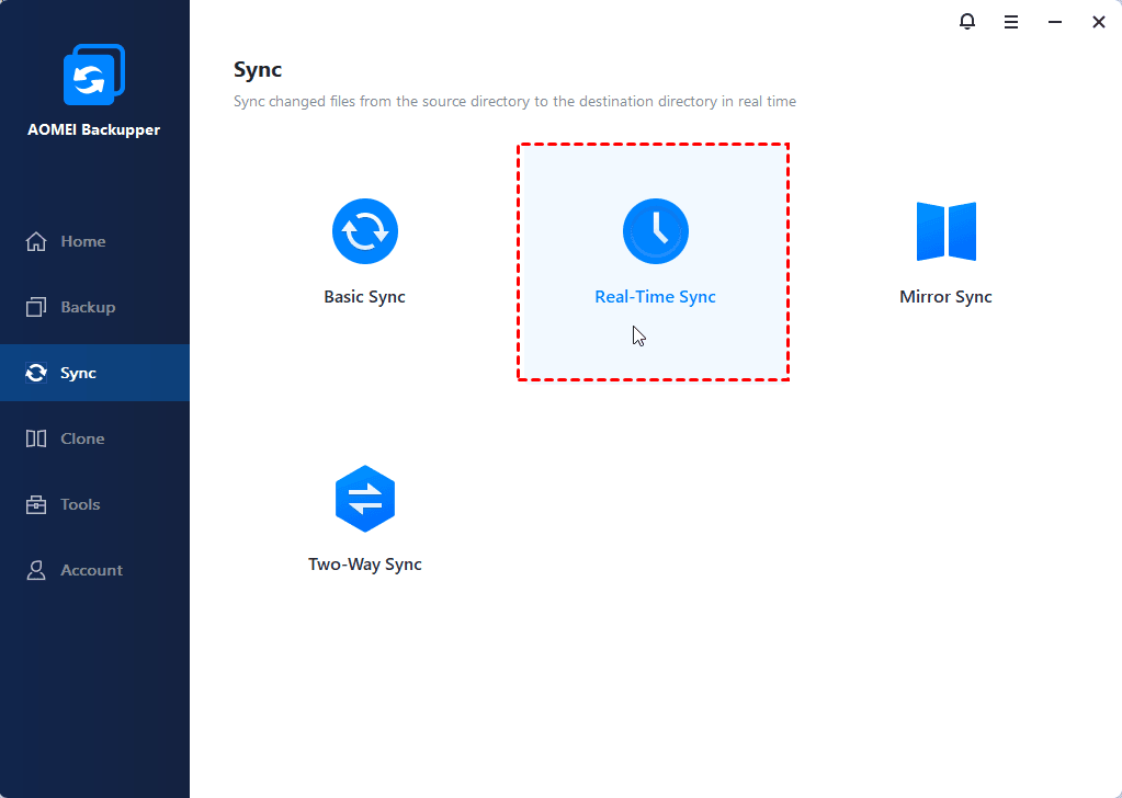 Note: The Real-Time Sync feature in AOMEI Backupper runs in one way (source → destination). If you want to automatically sync data from source to destination as well as the other way around, choose the Two-Way Sync feature and enable Schedule Sync.