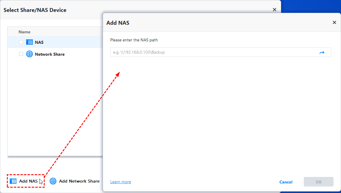 2. Click Select Source > Share/NAS > Add NAS to enter the path of the local Synology NAS. Select one shared folder on it (the folder you want to sync) and click OK.
