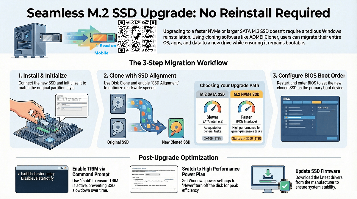 Upgrading to a larger or faster M.2 SSD is one of the easiest ways to boost your computer’s performance. However, many users worry that replacing their current drive means reinstalling Windows, applications, and personal files from scratch. The good news is that you can upgrade an M.2 SSD without reinstalling Windows by cloning your existing system to the new drive. Learn detailed cloning steps from this guide.