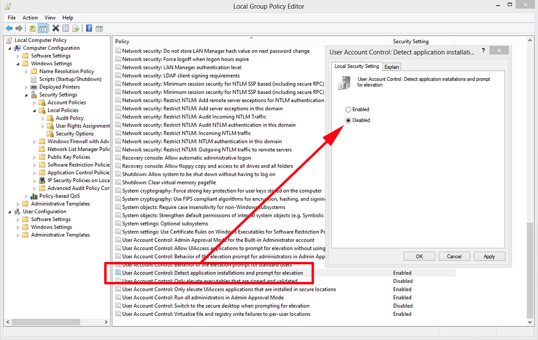 Step 3. Find the User Account Control: Run all administrators in Admin Approval Mode policy, double-click on it, and select Disabled. Click Apply, then OK.