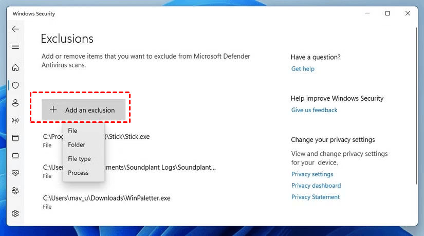 Step 4. Then, click on Add an exclusion and select File to choose the EXE (application) for a program to add to the exclusion list.
