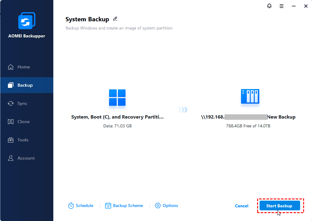 Step 6. Customize your backup with Options, Schedule, and Backup Scheme as necessary. Finally, click Start Backup to begin backing up Windows Server 2019 to your NAS.