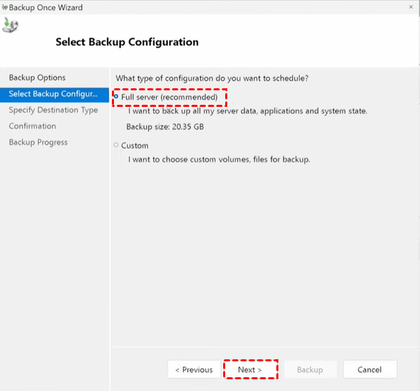 Step 4. Choose Full Server to back up everything (system, applications, and data) and hit Next. You can also choose Custom to select specific volumes or files.