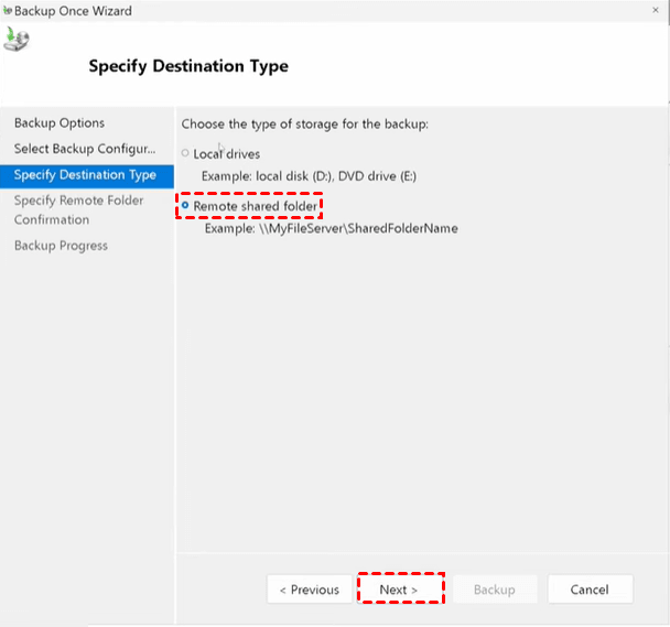 Step 5. Choose a backup destination: Remote shared folder, and press Next. Then type your NAS path and click Next.
