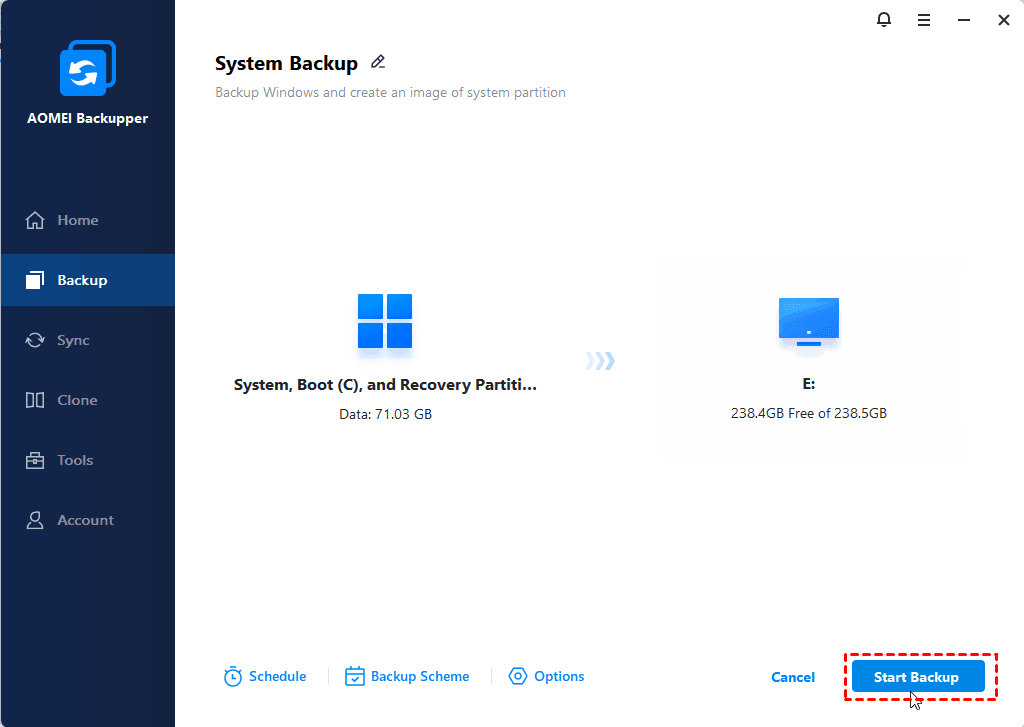 Follow the steps below to create a Windows Server image backup with AOMEI Backupper. Take System Backup as an example: