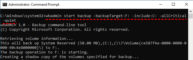 wbadmin start backup -backupTarget:F: -include:C: -allCritical -quiet