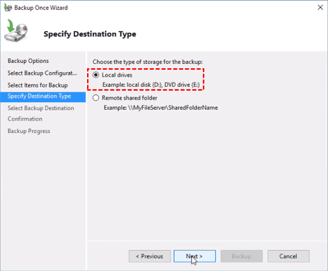 Step 5. Select a backup destination (local disk, external drive, or network share) and press Next. Here I choose Local drives.